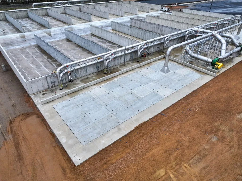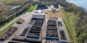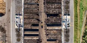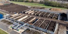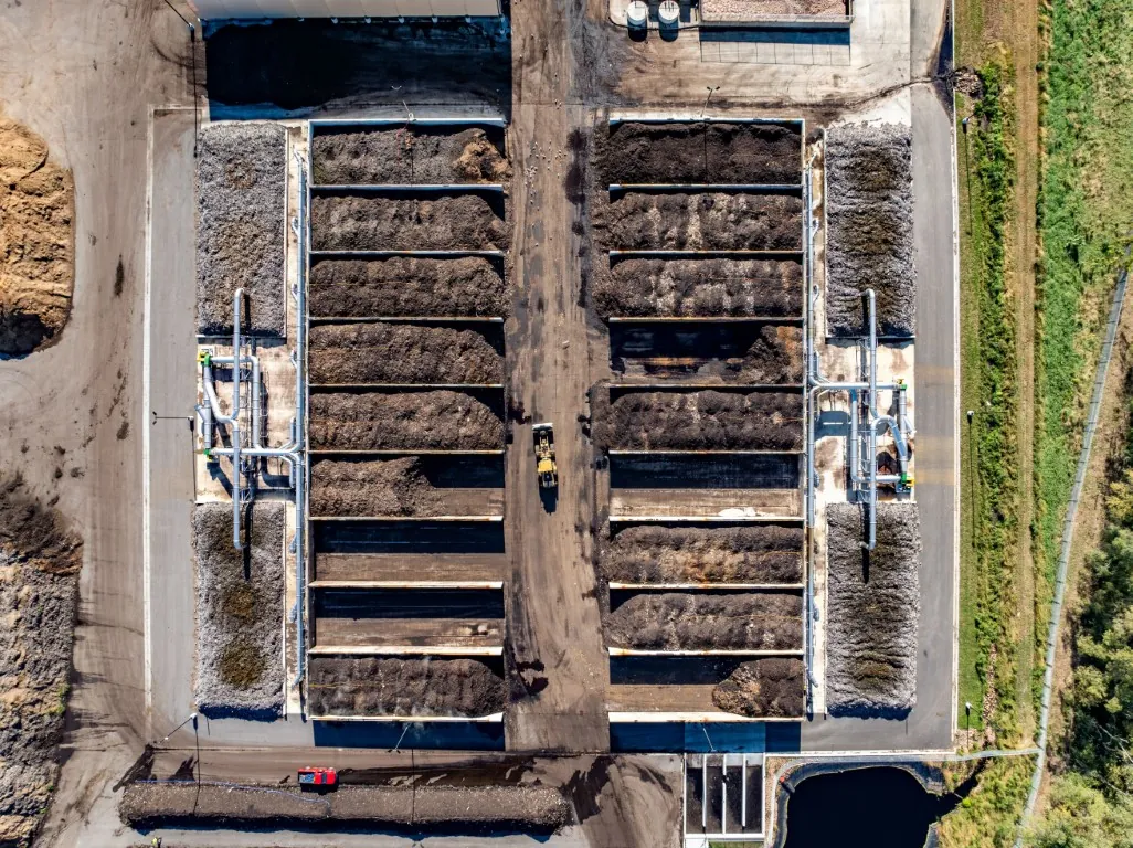 ECS designed this 18 zone composting facility with reversing aeration, heat recovery, and stainless-steel trench floors to efficiently process diverse feedstocks in intense weather conditions. The system exhausts process air through free-standing biofilters when running negative aeration, and surface-applied biolayer caps during positive aeration for exceptional odor and emissions control. The reversing aeration technology helps to evenly distribute oxygen and heat, allowing for greater process control, moisture management, and rapid feedstock stabilization.